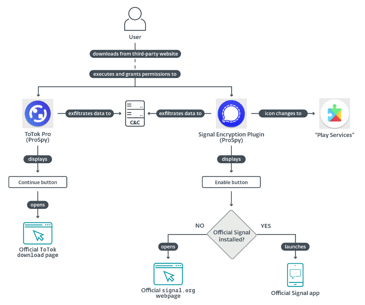 - ProSpy impersonates both Signal and ToTok, while ToSpy targets ToTok users exclusively.